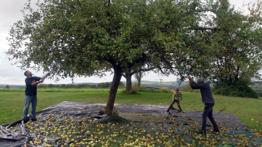 Am Anfang steht die Apfelernte. Jeder Baum wird schonend geschüttelt und die Äpfel fallen auf den mit Planen ausgelegten Boden. Die Planen sind notwendig um die fallenden Äpfel sanft aufzufangen und sie vor Beschädigungen und Verschmutzungen zu schützen. Denn jeder einzelne Apfel ist die Grundlage für unseren Viez und Apfelsaft und muss somit unseren hohen Qualitätskriterien entsprechen. Bereits bei der Ernte wird jeder Apfel das erste Mal geprüft. Nur reifes und gesundes Obst ohne Fehlstellen findet den Weg in die Viezgarage.